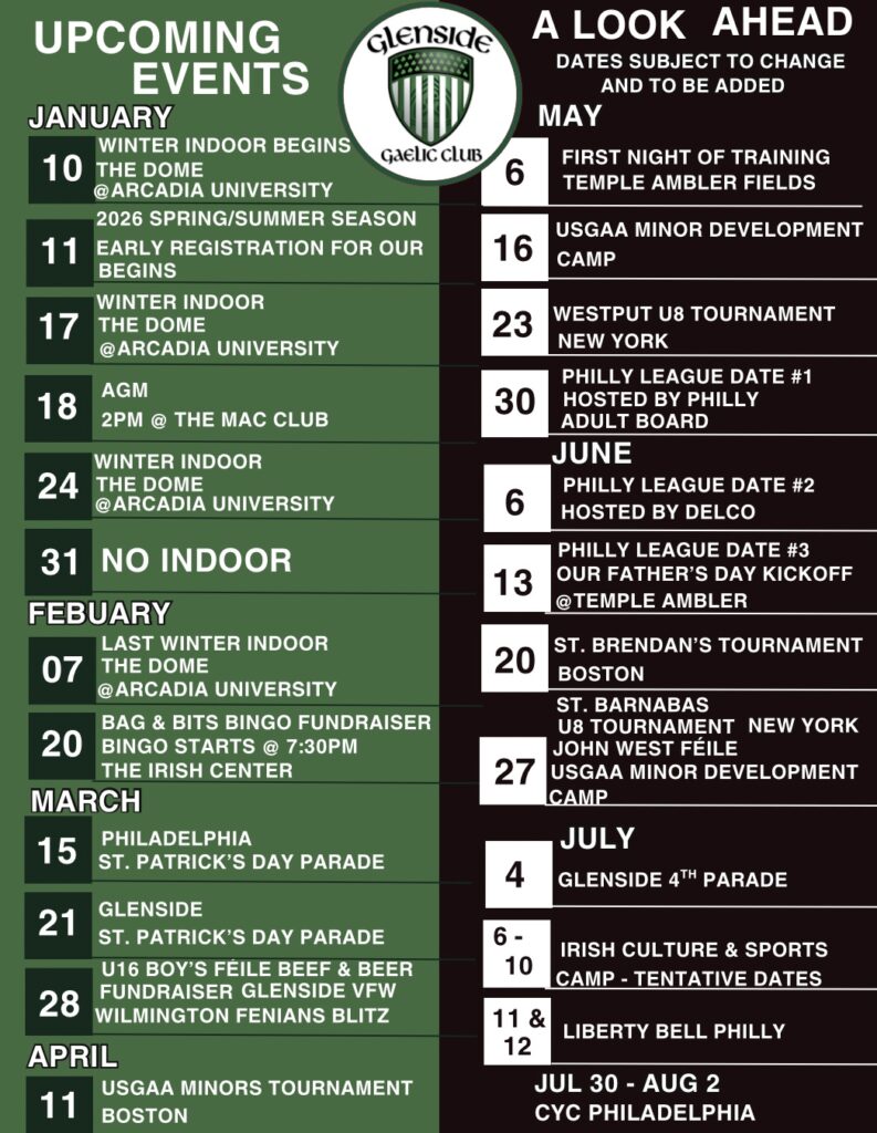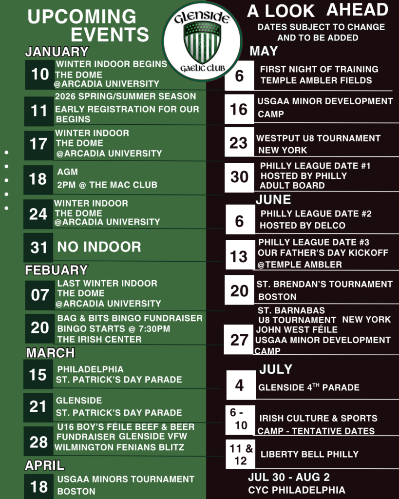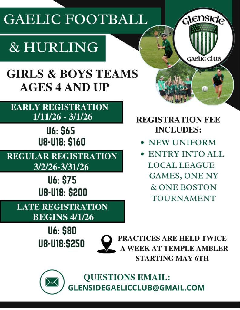 The Glenside Gaelic Club is a youth sports club registered with the USGAA dedicated to the promotion of Irish Culture through learning and participation in Irish sports and activities.