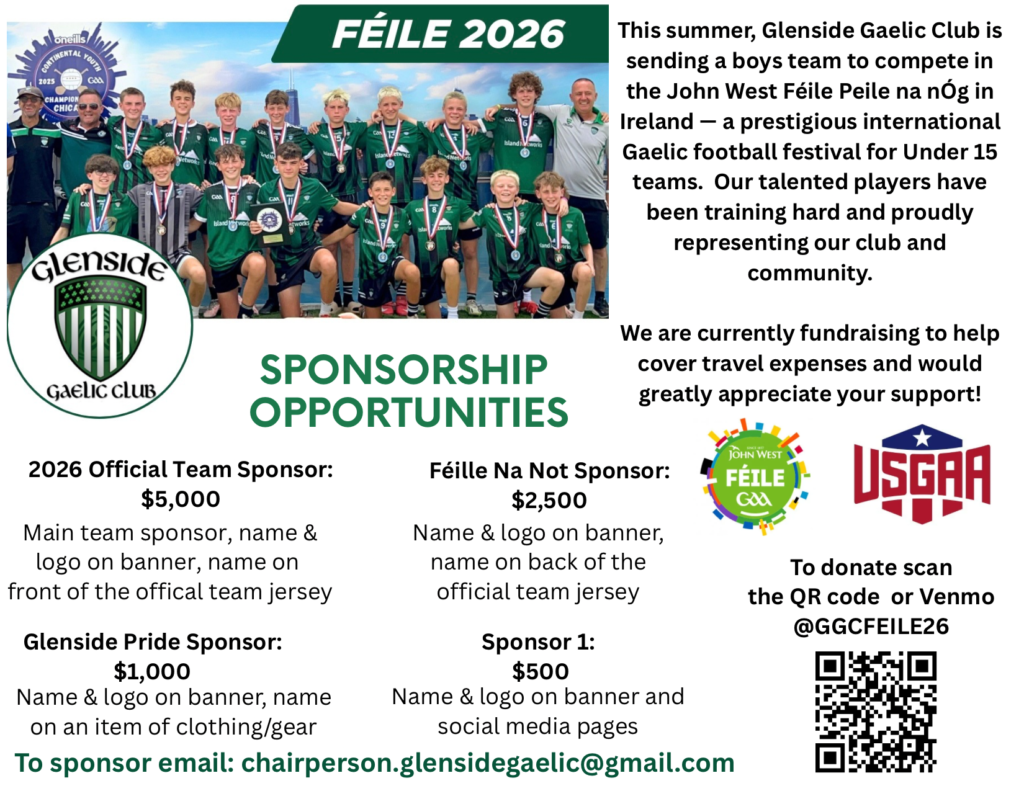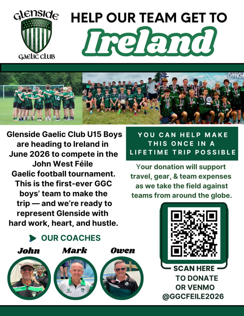 Our Glenside Gaelic Club U15 Boys are heading to Ireland in June 2026 to compete in the Féile Peile na nÓg, one of the biggest youth Gaelic football tournaments in the world!