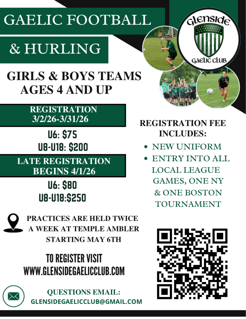 The Glenside Gaelic Club is a youth sports club registered with the USGAA dedicated to the promotion of Irish Culture through learning and participation in Irish sports and activities.